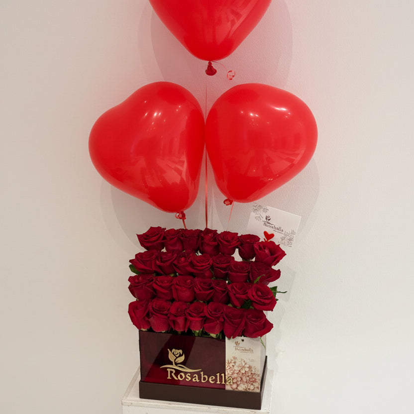 Fresh red roses arranged in a square luxury box