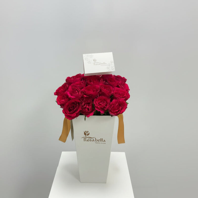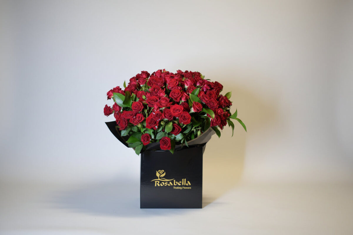 Fresh red and pink roses artistically arranged with soft greenery, finished in a natural wrap for a romantic, garden style look