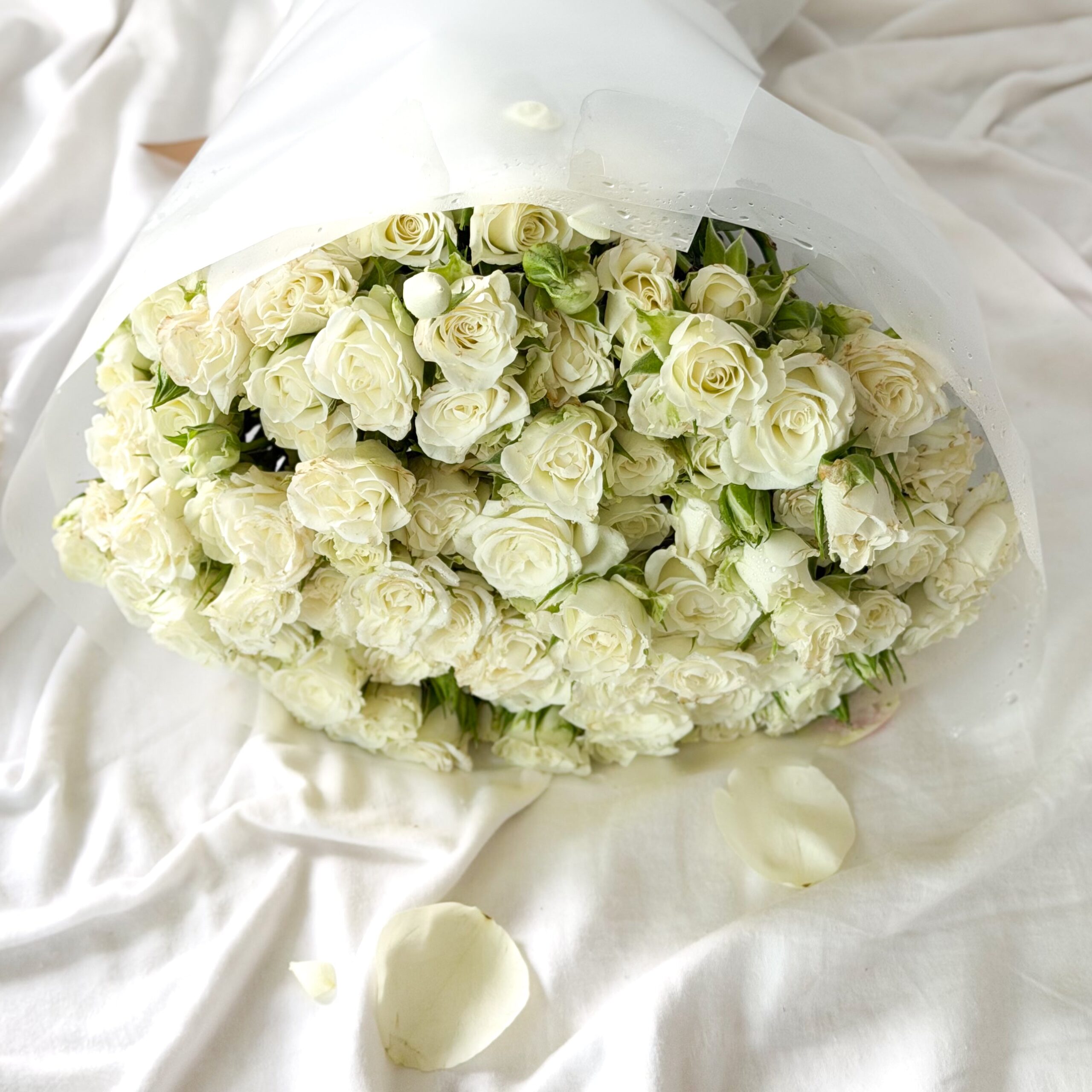Timeless white rose bouquet, hand-tied and elegantly wrapped for every meaningful moment